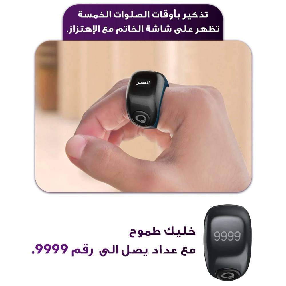 عداد تسبيح ذكي يمكنك بسهولة حساب وتسجيل أوقات التسبيح اليومية، يقوم الخاتم بالأهتزاز تلقائياً للتنبيه عند ال 33 تسبيحة – 66 تسبيحة – 99 تسبيحة – 100 تسبيحة، ويمكنك من خلال التطبيق تخصيص واضافة خصائص أخرى تتوافق مع عادات التسبيح اليومية الخاصة بك حتى 65 ألف تسبيحة باليوم الواحد.